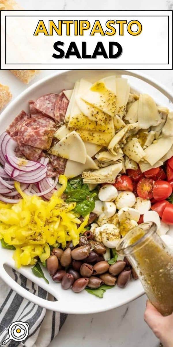 - Lay your greens in the bottom of a bowl, then top with your antipasto items. Give the dressing one last whisk or shake, then drizzle over the salad (start with half the dressing and add more as needed). Toss the salad until everything is coated in dressing, then enjoy.