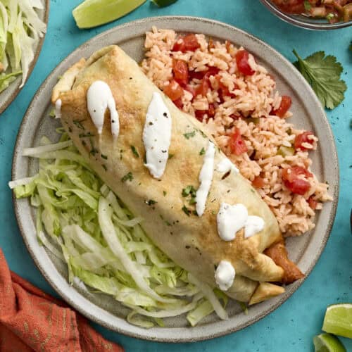 For meal prep, you can either freeze fully assembled (unbaked) chimichangas, wrapped tightly, for up to 3 months or just freeze the cooled filling in an airtight container. Thaw overnight in the fridge, assemble, and bake following the directions. You may need to add a few extra minutes to the bake time as the filling is cold. Cover with foil if the tops start to brown too quickly.