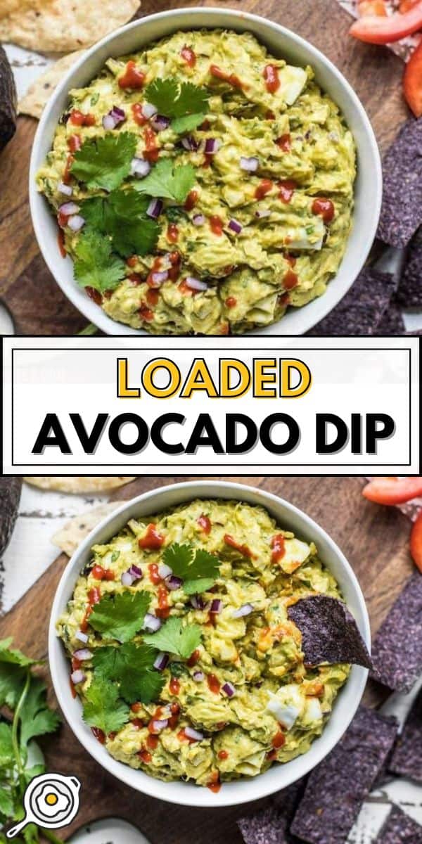 This unique blend of sweet pineapple, spicy sriracha, zesty red onion, creamy avocado, and rich hard boiled eggs makes this the best ever loaded avocado dip.