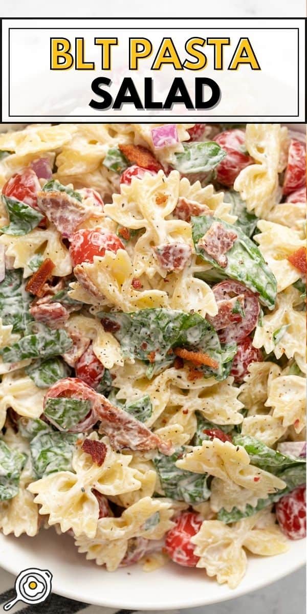 I think this BLT pasta salad is best once everything’s had time to cool down, so I always pop it in the fridge for a bit before serving. It’s great as a side or a light main. If I’m making it a meal, I’ll slice up some pan-fried chicken and lay it on top. It’s also totally giving BBQ and potluck energy, so I’d absolutely serve it with all my favorite cookout foods. I’m thinking grilled corn, chips and dip, pulled pork, and grilled BBQ chicken. It also pairs well with a sandwich, like a chicken club or a veggie melt.
