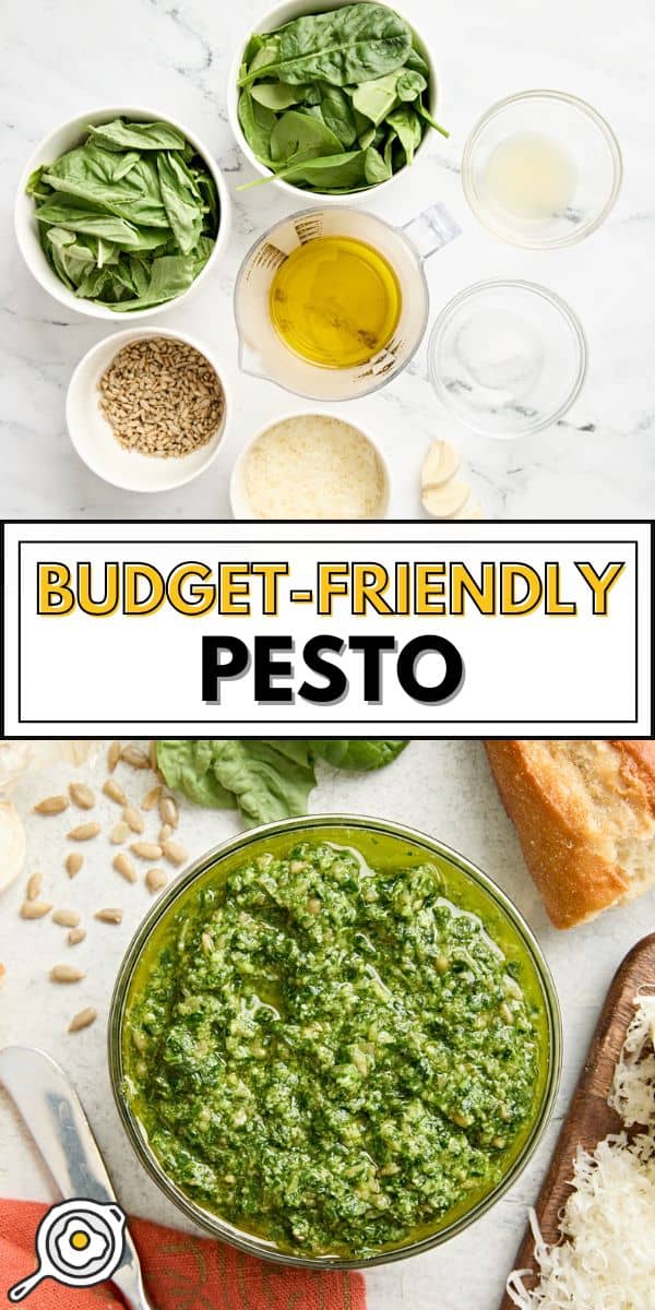 Basil pesto is traditionally made with pine nuts and all basil, but unless you grow your own basil and already have pine nuts in your pantry, that can get real expensive real quick. This version is inspired by traditional pesto but uses roasted sunflower seeds and a mix of basil and spinach to keep things budget-friendly. I’ve found they’re much more affordable, and you’d never guess it’s a twist on the original because it still packs so much flavor! The sunflower seeds add a rich, nutty depth, and the garlic, Parmesan, and fresh basil make each bite taste just right. 😋