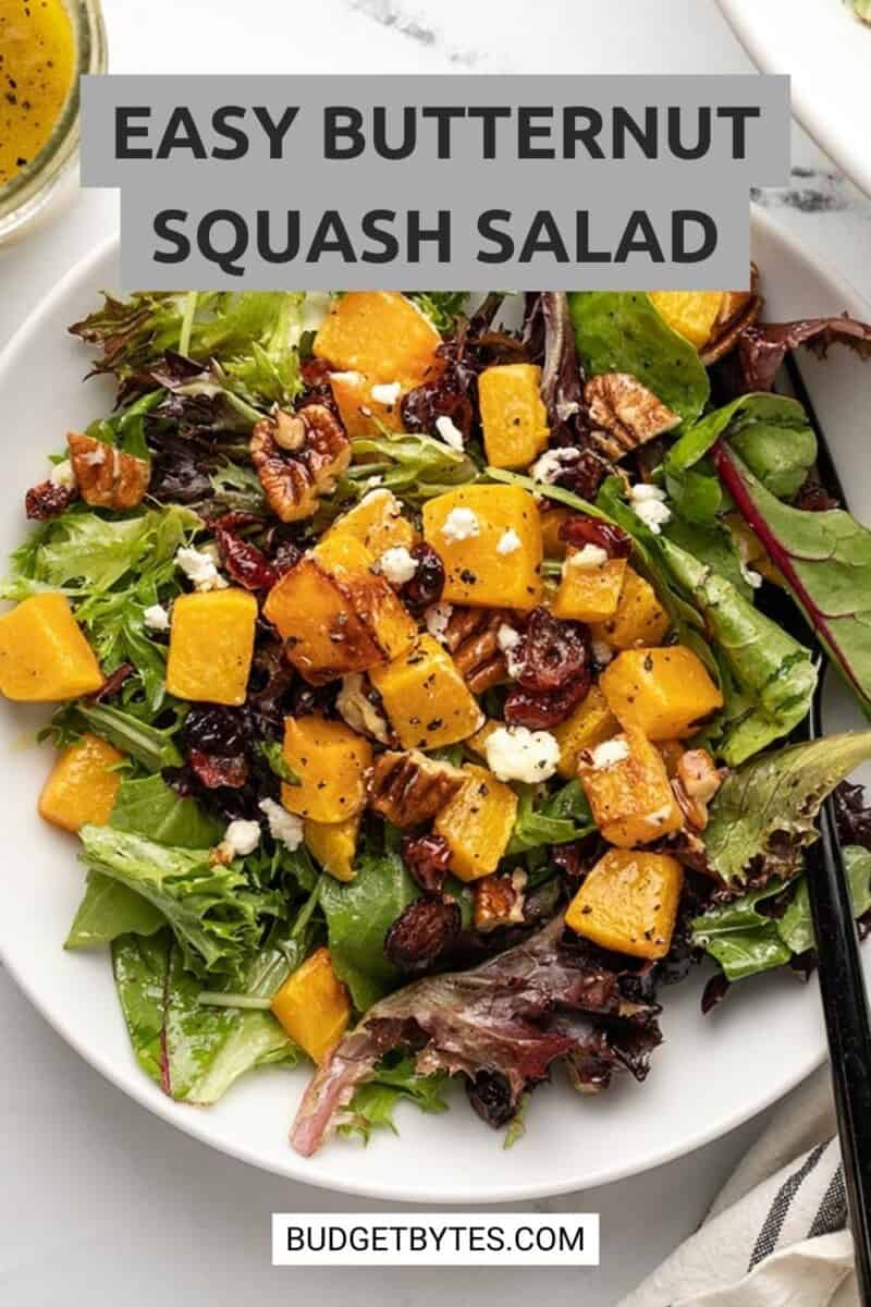 One of the best ways you can keep your food budget in check is to make sure you’re using up what you’ve got in your pantry. So this week I used up a bunch of “leftover” ingredients I had on hand to make this absolutely gorgeous butternut squash salad. It’s simple but elegant, and very easy to prepare. Plus, it meal preps great, so I’m definitely going to eating this for lunch for the next few days!