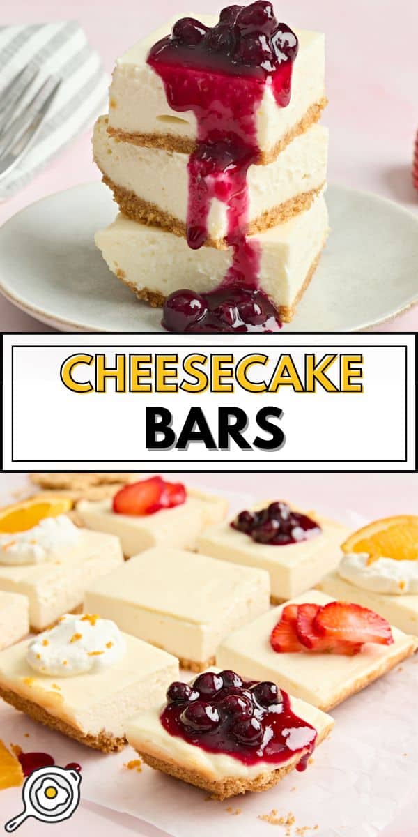 I make the cheesecake filling in this recipe with a mix of cream cheese and Greek yogurt. The cream cheese keeps it rich and creamy, while the Greek yogurt adds some tang and helps lighten it up. And while a no-bake cheesecake is delicious, baking these cheesecake slices is what gives them their structure. You can slice them cleanly, pick them up with your fingers, and transport them easily for potlucks, parties, or as an on-the-go treat! They’re a delicious make-ahead dessert that’s perfect for beginners AND experienced home bakers to enjoy.