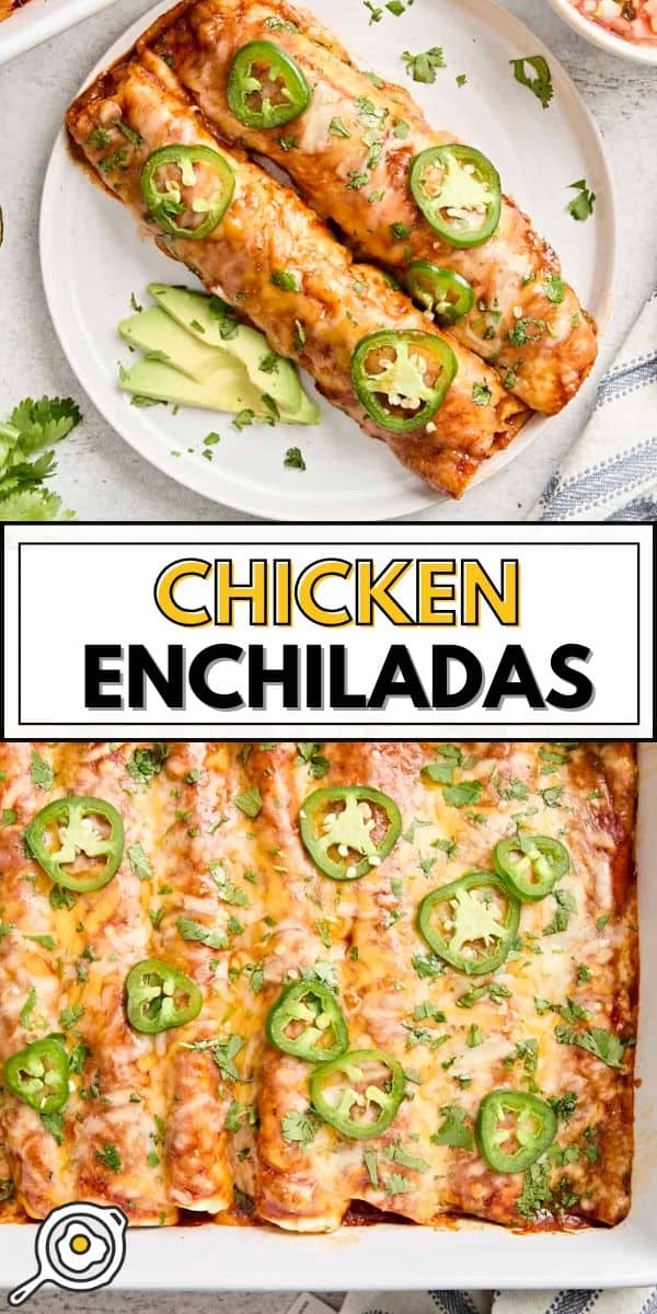 Chicken enchiladas are a popular Mexican dish, often made from rolled corn tortillas filled with chicken and topped with a savory chili-based enchilada sauce and cheese. They’re baked in the oven until warm, gooey, and delicious! My recipe is more Tex-Mex style, as I use flour tortillas over corn (but you can use whichever you prefer!) and canned green chiles in the filling. However, there are many variations of this dish, with different fillings and sauces depending on the region or personal preference.