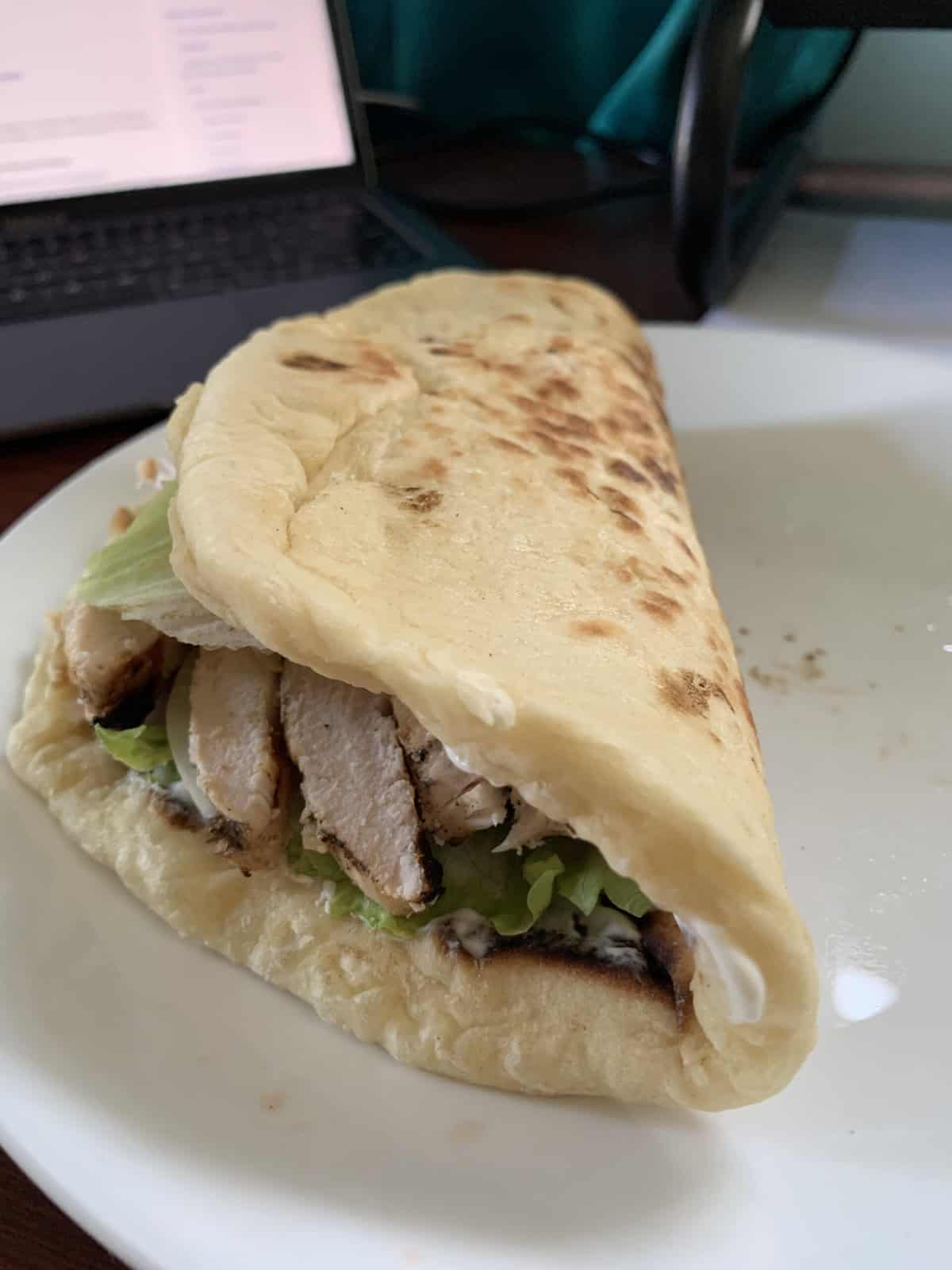 - Build the sandwiches. Spread the yogurt sauce on your flat bread, top with the chicken and vegetables. Roll the sandwich closed. You can wrap the sandwich in foil to help it stay closed as you eat.