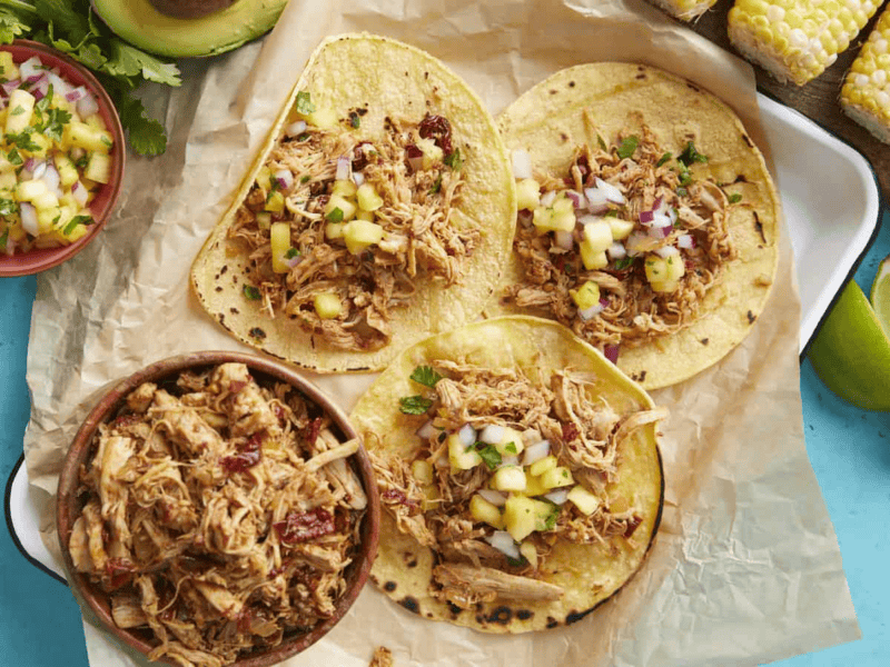 - Assemble the tacos. Add 1/4 cup of pulled chicken to a corn tortilla and top with pineapple salsa. Serve these babies up and enjoy a weeknight win!