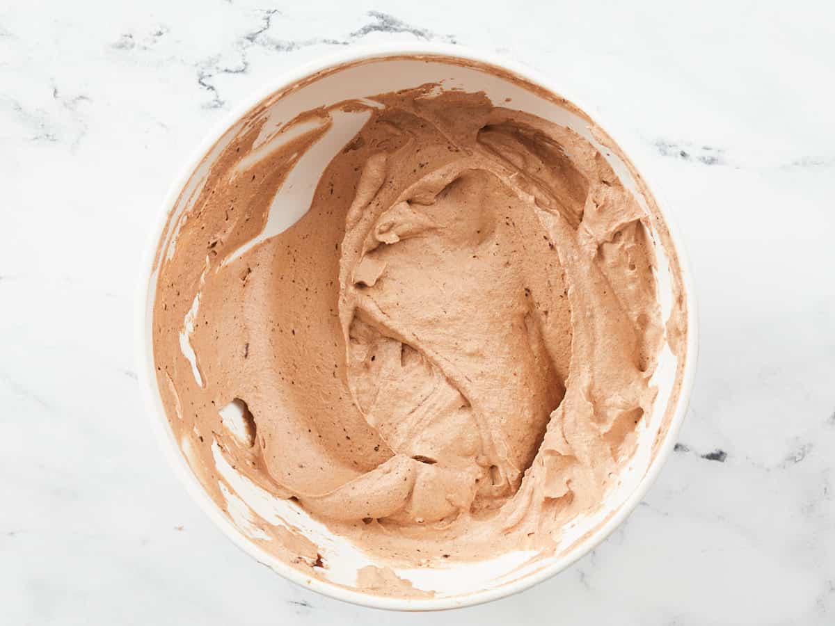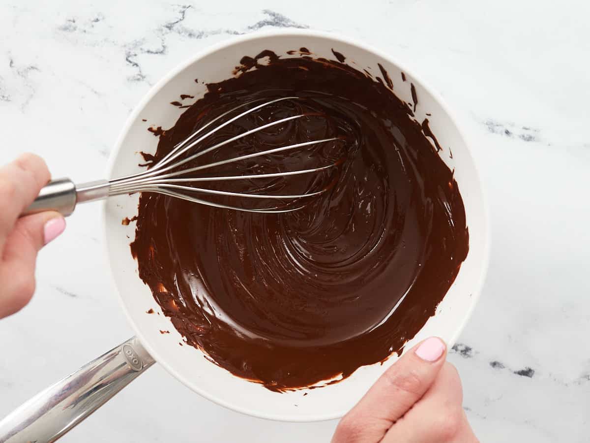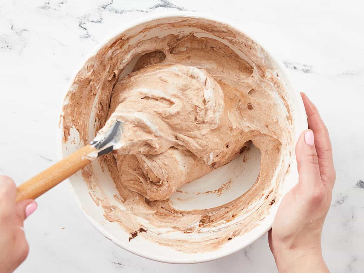 - Gently fold the whipped cream into the chocolate in thirds. There should be no white streaks.