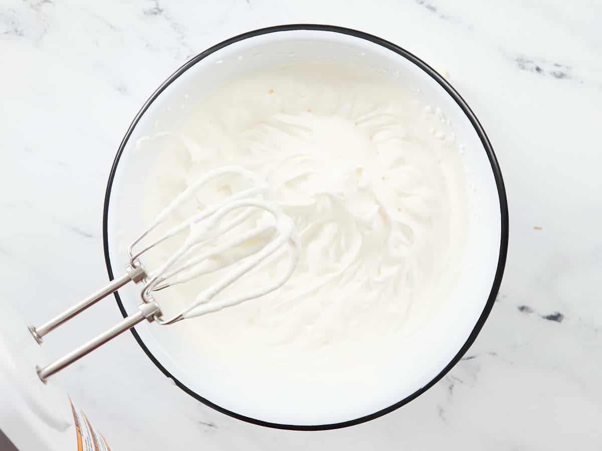 - In a separate large mixing bowl, whip the egg whites on medium speed to soft peaks. Add the sugar and continue beating until stiff peaks form (the tips should stand straight up when you remove the beater).