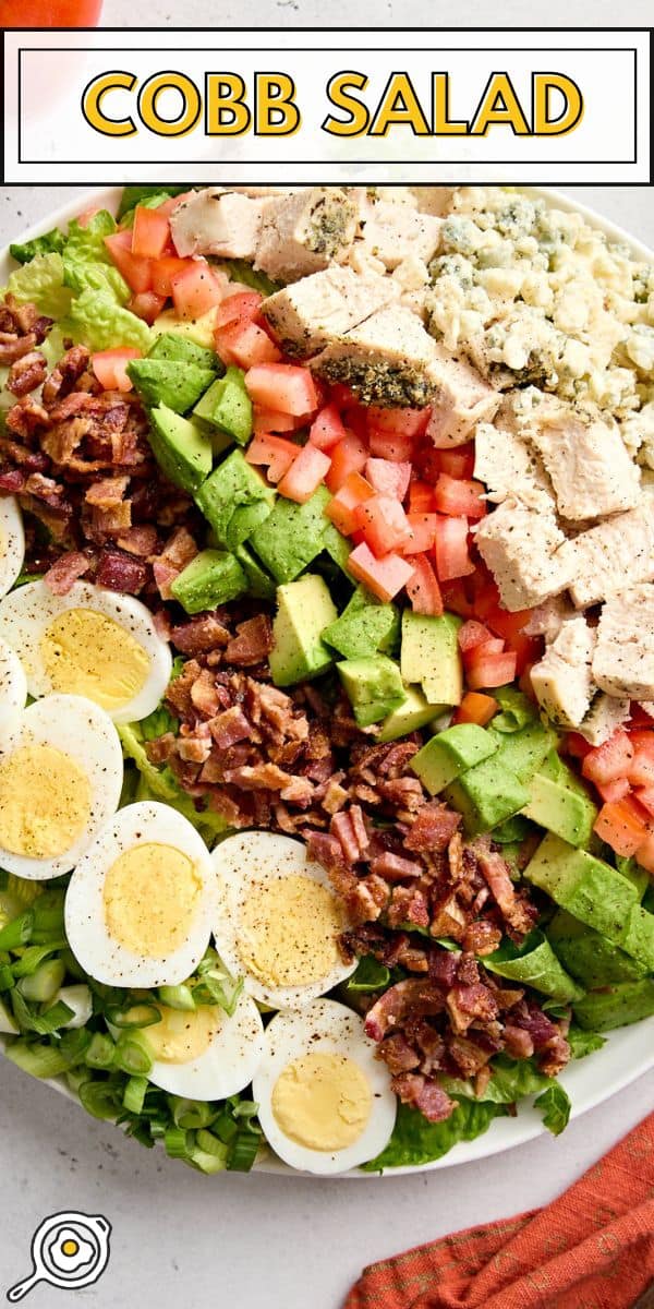 Cobb salad is a classic American salad packed with crisp lettuce, juicy tomatoes, creamy avocado, blue cheese, chicken, bacon, and hard-boiled eggs. It’s fresh, so incredibly filling, and totally delicious. It’s believed to have been originally created in L.A. at the Hollywood Brown Derby restaurant, using leftovers from the kitchen, and is named after the owner. For my recipe, I dress my salad with an easy homemade red wine vinaigrette (seriously, it’s so much better than any store-bought dressing!), but this recipe is easy to customize!