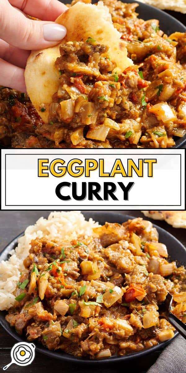 This easy eggplant curry is one of my favorites because it works just as well as a main dish as it does as a warm dip in the middle of the table. If I’m going the main-dish route, I’ll spoon it over fluffy basmati rice and add something cool on the side like cucumber raita and a warm naan. Roti, paratha, pita, or any warmed flatbread are also delicious for dipping into this curry. I’d also never say no to some puff pastry samosas and a little onion chutney on the side, either!