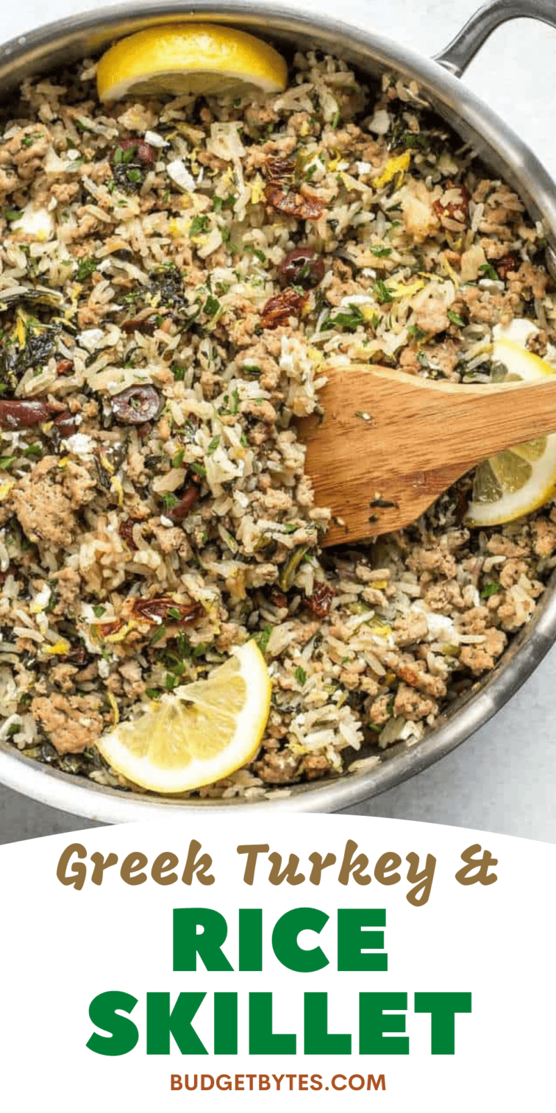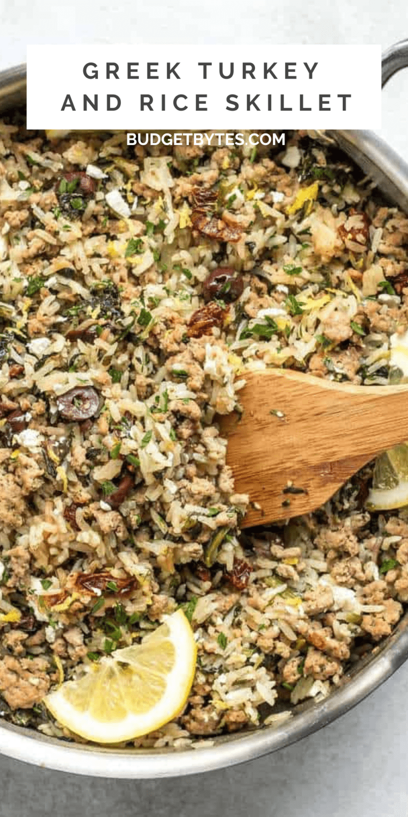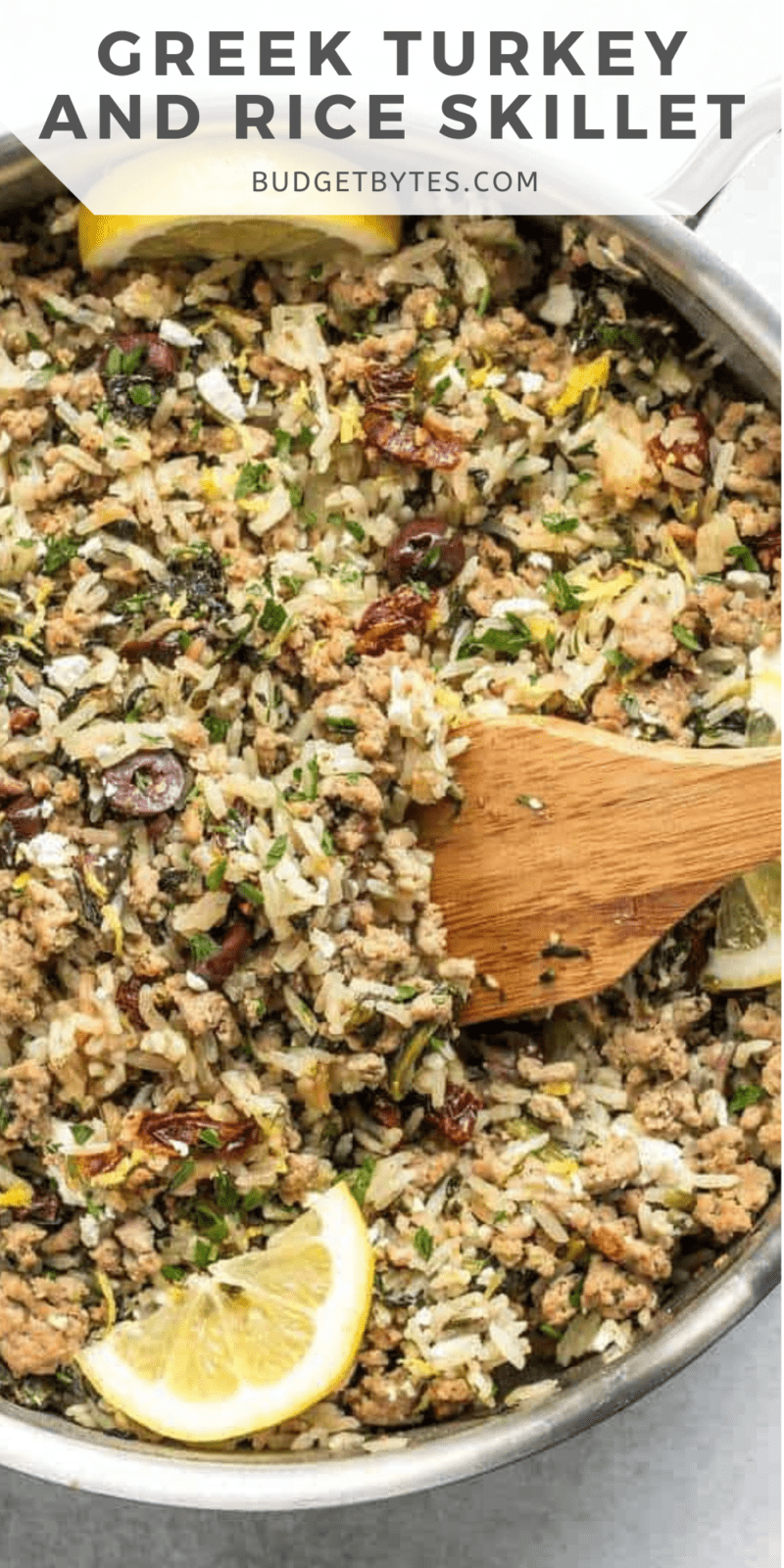 OMG yum yum yum! This recipe is an instant new favorite! I’ve been all about the skillet and one-pot meals lately because I’m super busy, so today I made this Greek Turkey and Rice Skillet, which is like a deconstructed version of my Greek Turkey Burgers. The recipe is super simple and uses small amounts of super flavor potent ingredients, like feta and Kalamata olives, to deliver a big flavor punch without driving the price way up.