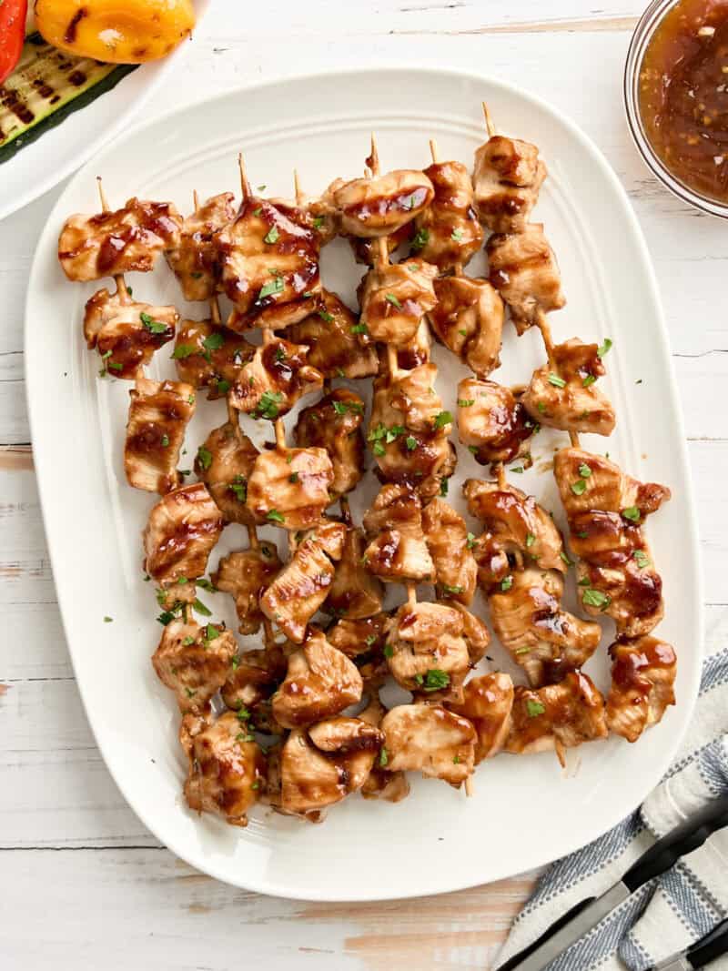 To serve more people without stretching your budget and buying more meat, you can add veggies like bell peppers, onions, or zucchini to the skewers. Pineapple is great too! You’ll see the same idea in my grilled shrimp and pineapple skewers, and it’s just as delicious with these teriyaki chicken kebabs.