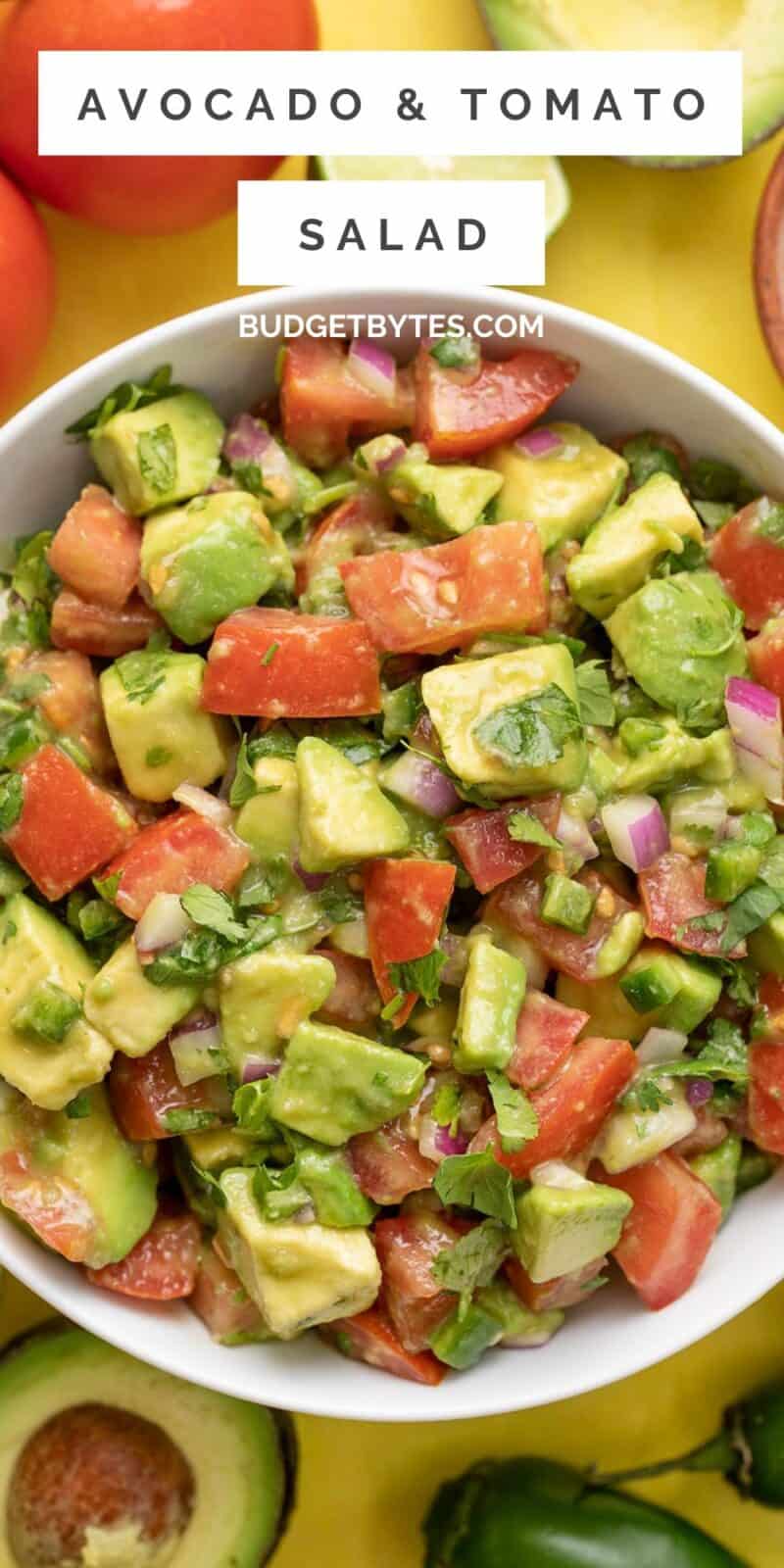 Guacamole is one of my most favorite foods ever, but avocados can get really pricey. So when I’ve got that guac craving I mix up a batch of this simple avocado and tomato salad. It has all the same amazing flavors as guacamole, but with a slightly different ratio of ingredients to make it a bit more budget-friendly. This salad is so good that I love to spoon it over everything–eggs, chicken, fish, green salads, tortilla chips, and sometimes I just scoop it up right out of the bowl with a spoon. 😅