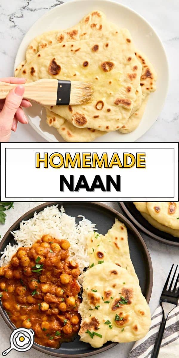 Naan is a traditional flatbread made in South and Central Asian countries. It is made with yogurt and egg, which makes it a little more tender and fluffy. It is traditionally cooked in a clay tandoor oven, which helps produce the bubbled texture.