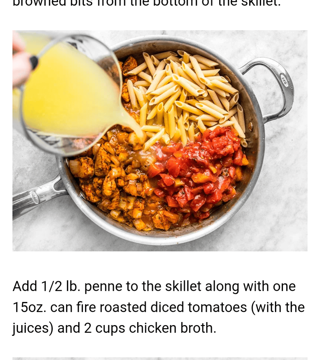 Add 1/2 lb. penne to the skillet along with one 15oz. can fire roasted diced tomatoes (with the juices) and 2 cups chicken broth.