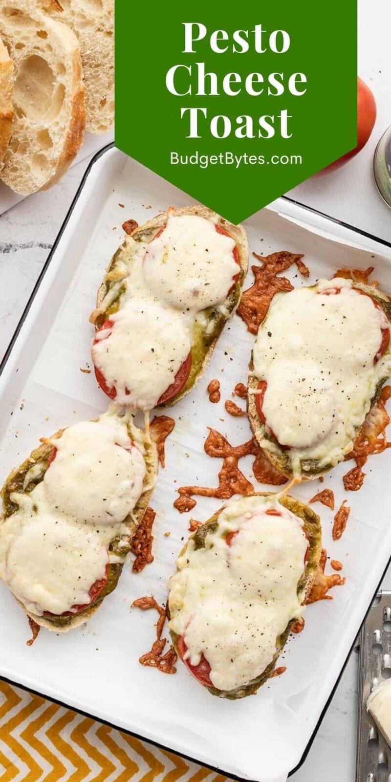 Pesto cheese toast makes a great alternative to garlic bread with any pasta dish or something like Tomato Basil Chicken, but it’s also great served alongside a bowl of tomato soup. These cheesy little toasts also make a great party appetizer! You can even serve it with a bowl of warm marinara for dipping. But perhaps my favorite way to serve this is with a fried or scrambled egg for breakfast. You just can’t beat that egg-pesto-tomato combo!!