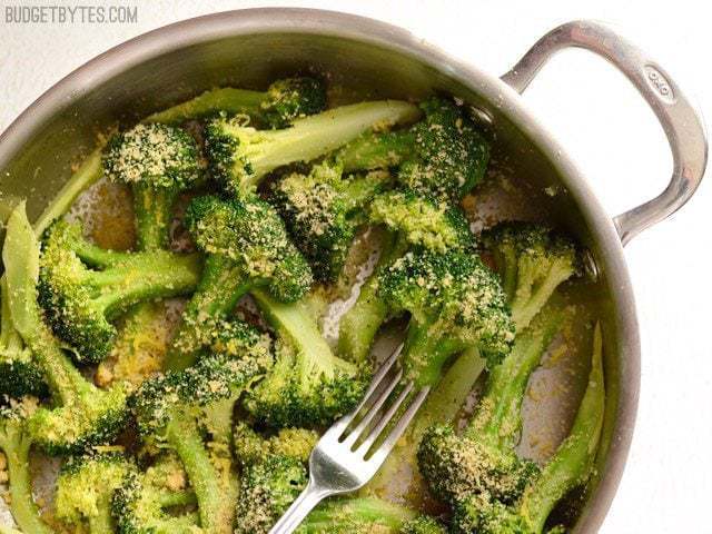 And that’s it! Ready to eat! If you want to take it one step further, you can pop the whole thing under the broiler for a minute or two (provided you’re using an oven-safe skillet) to brown up the Parmesan and the edges of the broccoli. That will give the dish a nutty/smoky flavor.