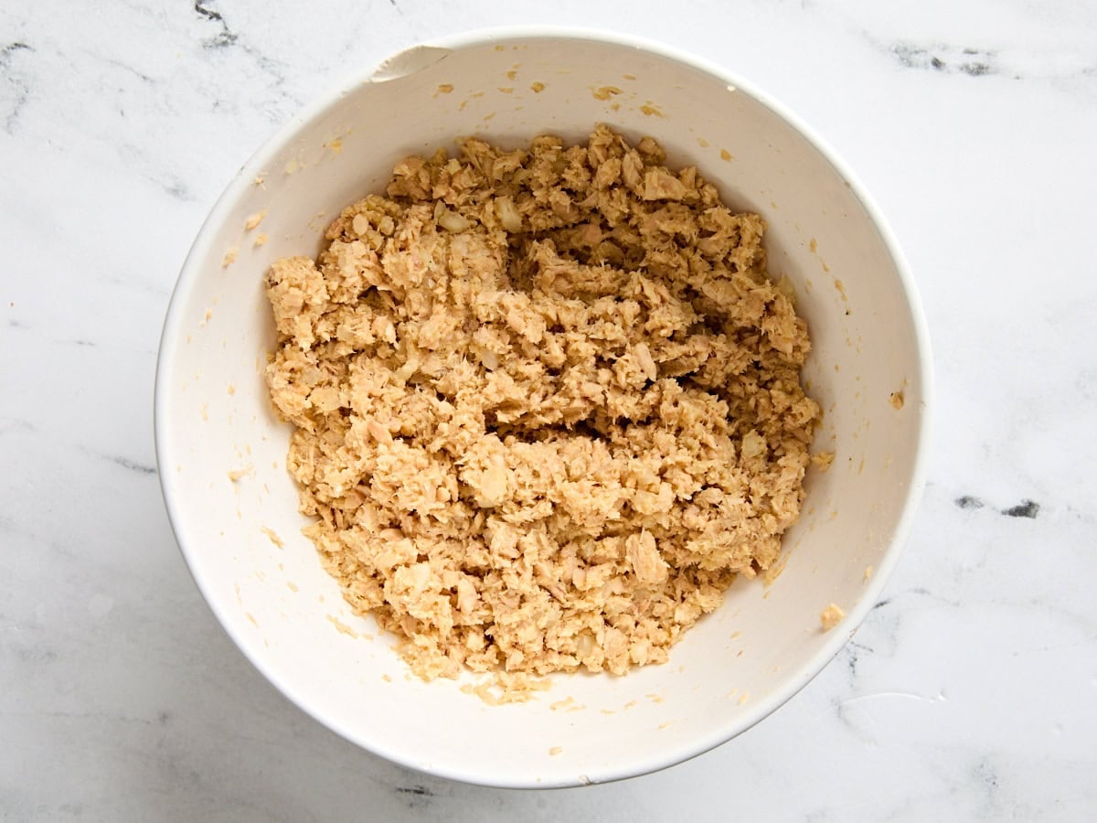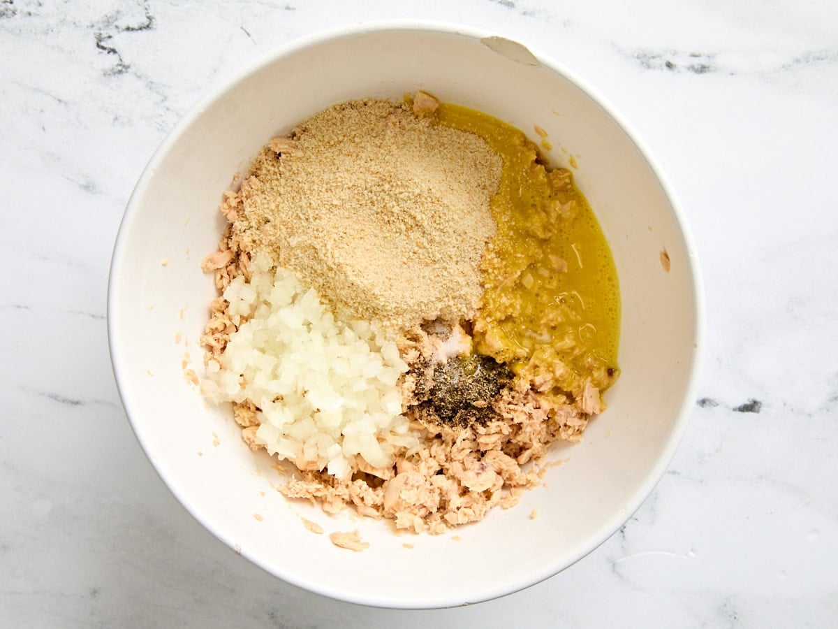 Combine the ingredients: Place the drained salmon into a large mixing bowl with ¼ cup finely diced onion, ¼ tsp salt, ¼ tsp freshly cracked black pepper, 1 large lightly beaten egg, 5 Tbsp plain breadcrumbs, and 1 Tbsp lemon juice.