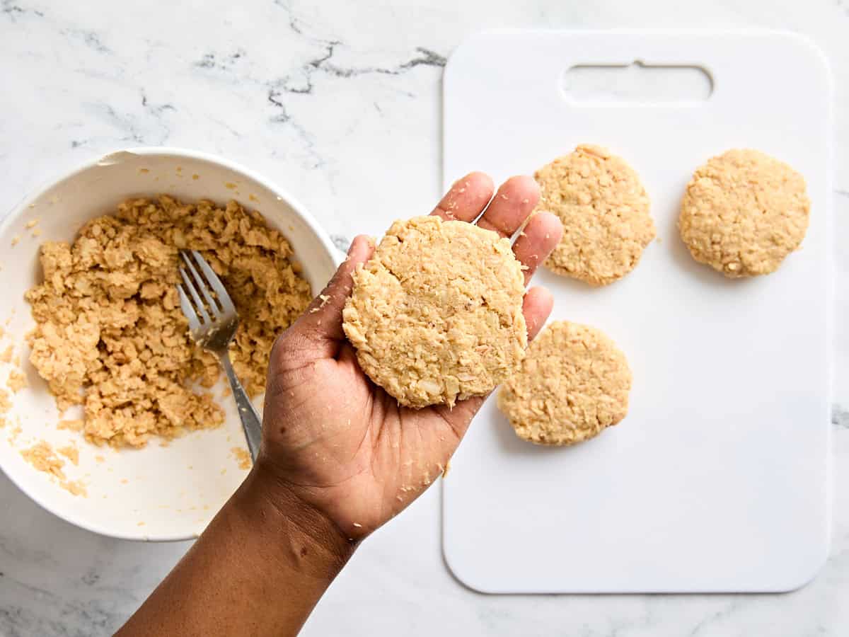 - Now begin to shape the salmon mixture into large patties. Take 3-4 tablespoons of the mixture and shape the patties with your hands. You should end up with 6-7 patties. Set the patties to the side.