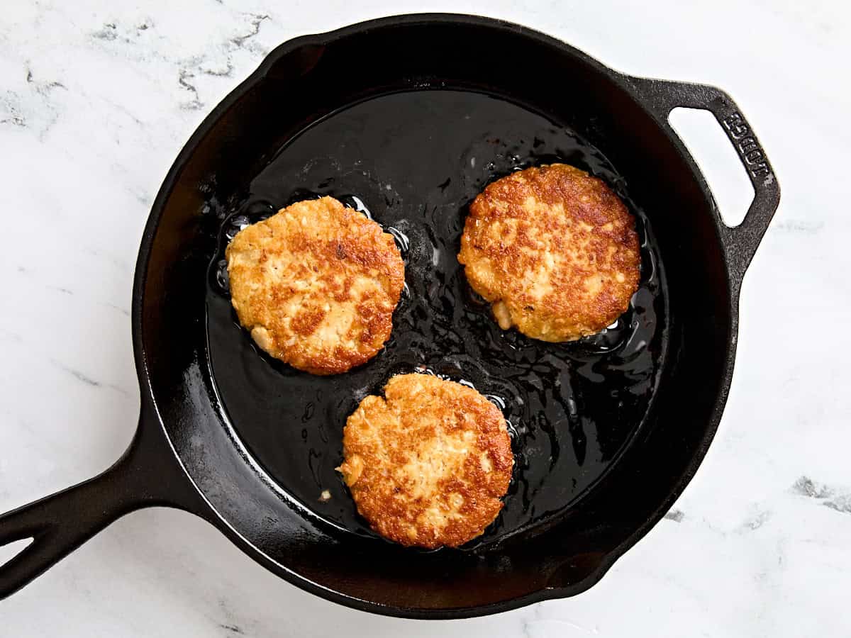 - Heat the cooking oil in a cast iron skillet over medium heat.** Once the oil is hot, add the patties to the skillet and cook in 2 batches. Cook the patties for about 3 minutes on each side until they are golden brown.*** Gently flip the patties over when cooking on the second side to keep them from breaking apart.