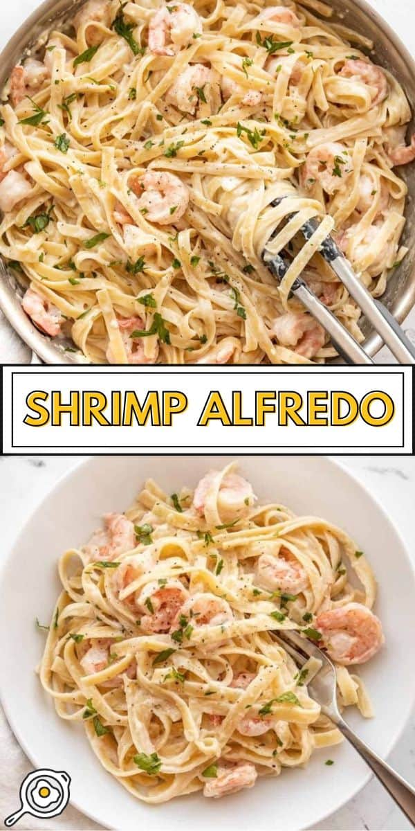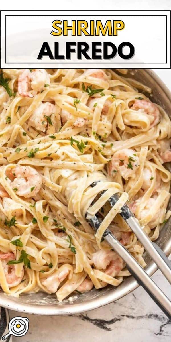 This incredibly simple dish features a rich and luxurious Parmesan cream sauce, tender shrimp, and hearty fettuccine noodles. I make the simple creamy Alfredo sauce with butter, garlic, heavy cream, and Parmesan, and it comes together in minutes. Then I add some fettuccine and juicy shrimp, which literally take about three minutes to cook in the skillet, and your fancy-pants pasta is done! I promise this one is just as easy as my chicken Alfredo, and anyone can do it!