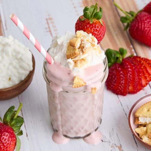 This Strawberry Cheesecake Smoothie recipe is a magic trick; it gives off dessert vibes while sneaking in some budget-friendly frozen fruits and protein-packed cottage cheese. It’s the best of both worlds (and super easy to make) if you ask me! Leave off the whipped cream and crumbled snack cookies if you’re trying to be good, but I encourage you to treat yourself!