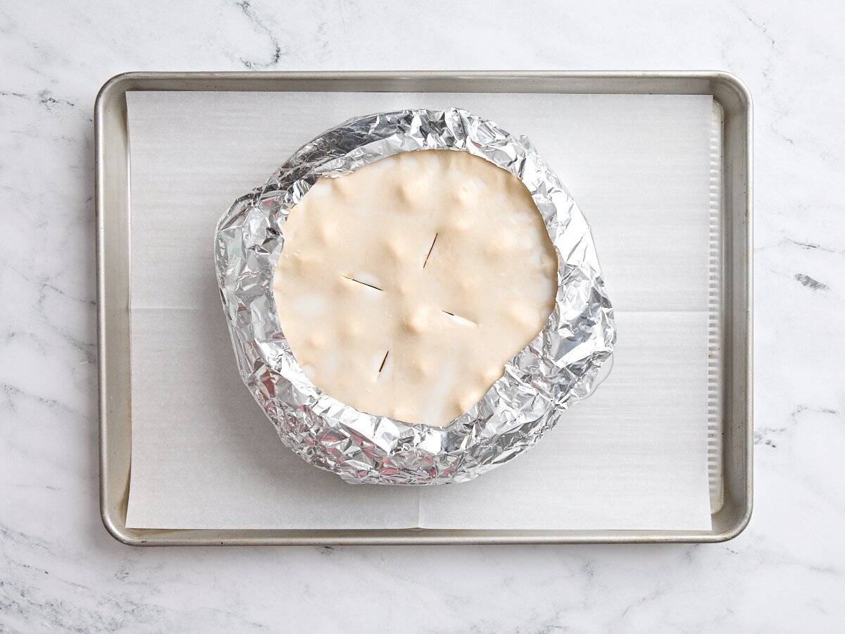 Add the foil: Wrap a 3-inch strip of tin foil around the edges of the pie to prevent burning.