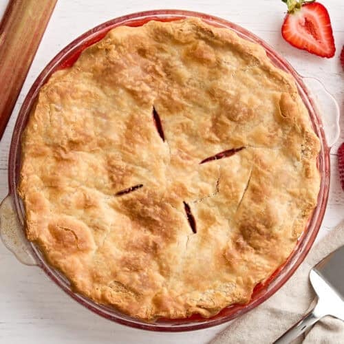 Homemade pies, including this rhubarb and strawberry pie, are best served fresh when the crust is golden, crisp, and still has that just-baked flakiness. But if you do have leftovers, you can keep them (once cooled) covered or stored in an airtight container in the fridge for about 3-4 days. Just note the crust will lose some crispness.