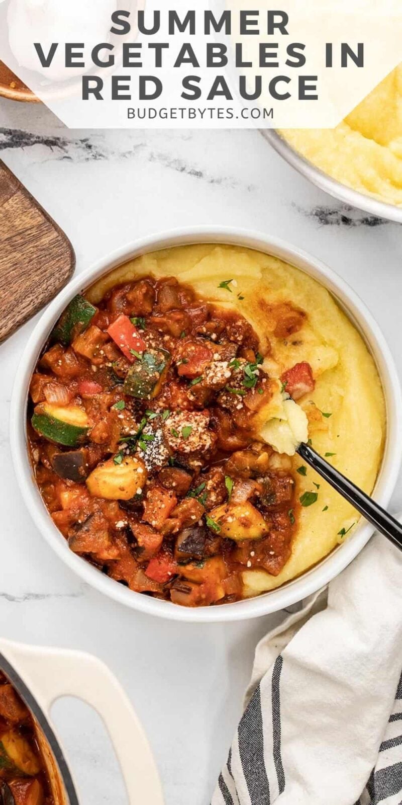 Add about ⅔ cup of the cornmeal to a bowl and top with 1 cup of the vegetables in red sauce. Top with a little more Parmesan and some chopped fresh parsley. Enjoy!
