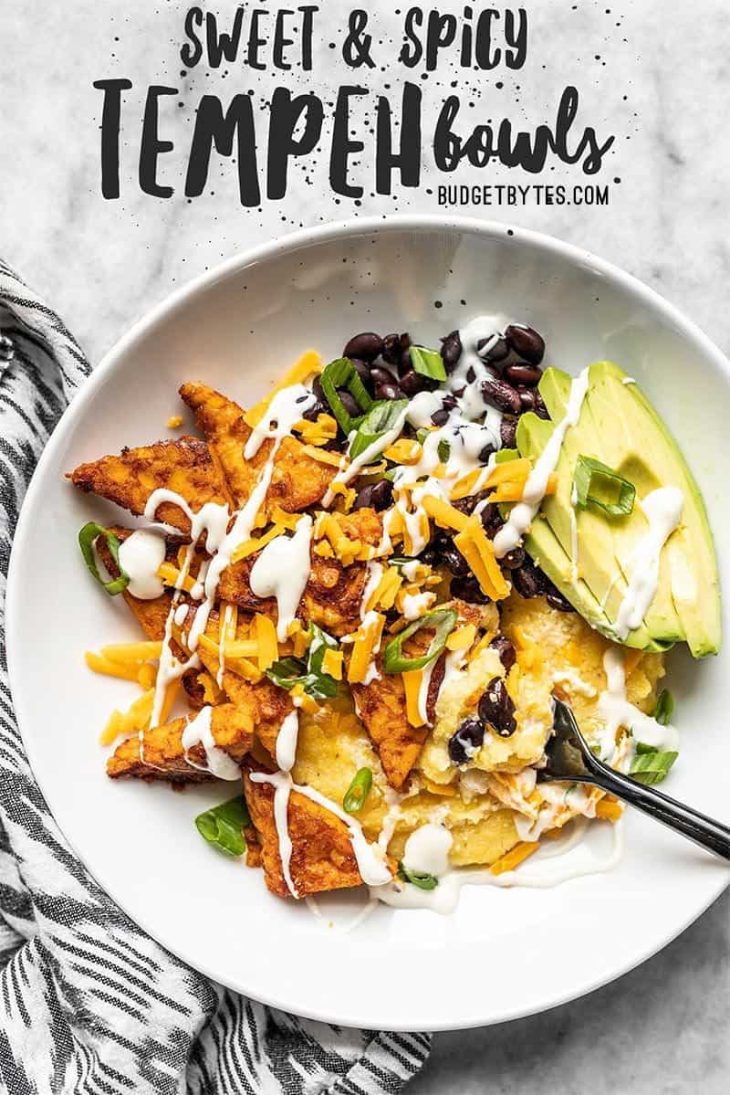 Happy New Year! My 31 Day Vegetarian Challenge officially starts today and I have to say, the first recipe I made for the challenge, Sweet and Spicy Tempeh Bowls, is pretty killer. I chose a bowl meal for my first meal of the month because they’re just so easy and filling, they pack up great for leftovers, and they’re flexible enough to accommodate using leftover refrigerator ingredients. This particular bowl meal features my favorite sweet and spicy spice blend, creamy polenta, black beans, cheddar, avocado, green onion, and a tiny drizzle of tangy ranch dressing. The combo of sweet, spicy, and creamy in this bowl is absolutely to die for!