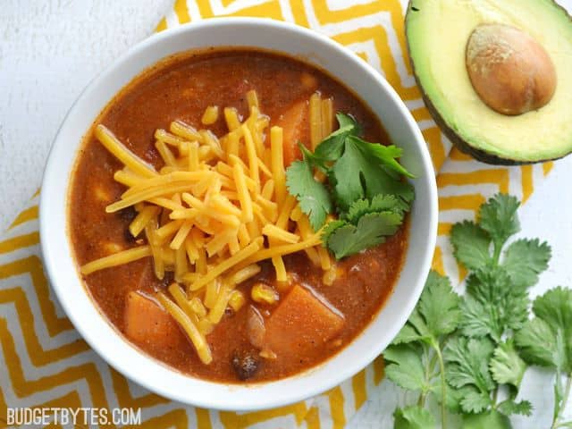 This is truly one of my favorite recipes of all time. I cannot tell any of you reading this enough how truly delicious this soup is. The only change I did (and it was on accident) was to use fire-roasted diced tomatoes. I have made this recipe so many times and for so many groups of people. It’s always a hit. People will initially worry about the lack of chicken while it’s cooking, and then afterwards, they’ve all but forgotten chicken ever existed. The sweet potatoes and masa harina elevate this soup in such an interesting way. If you’re on the fence, just TRY it. An added bonus: it’s the CHEAPEST meal to make. As a side note, I prefer cotija cheese or queso fresco as opposed to cheddar, just because they’re milder and the flavor of this soup is so nuts that I want to taste it and not necessarily cheese. Try it both ways and see what you like more.