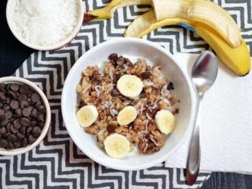 Bananas, peanut butter, coconut, and chocolate chips fill this baked oatmeal with loads of flavor, texture, and fun! Step by step photos.