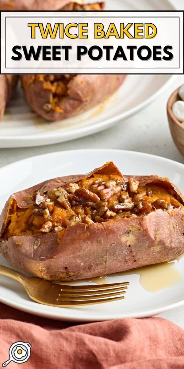 Twice baked sweet potatoes are sweet potatoes that are baked twice in the oven. They’re first baked whole until the insides are tender. Then the creamy flesh is scooped out and mixed with butter and warm spices like cinnamon, nutmeg, and vanilla. The perfectly flavored filling is then stuffed back in the sweet potato and baked a second time in the oven. The best part is you can top it with your favorite toppings! It’s seriously divine ;)