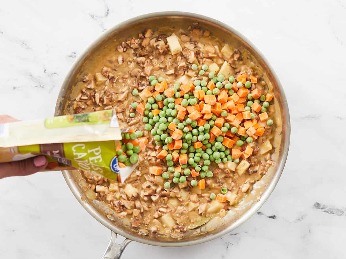 Next, take the skillet off the heat and add 12 ounces of frozen mixed vegetables to the filling. The frozen veggies will quickly cool the other ingredients in the pan. Your filling is done!